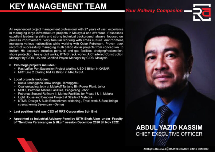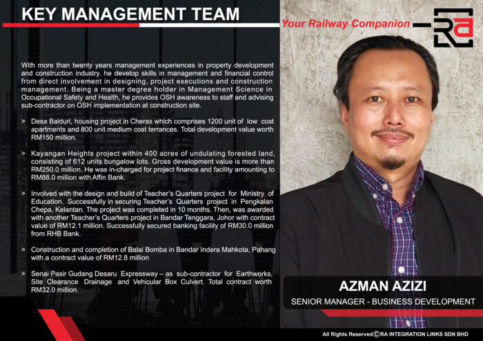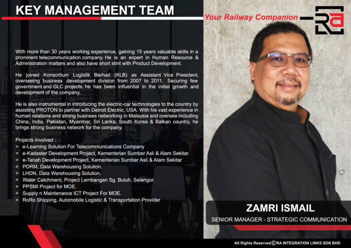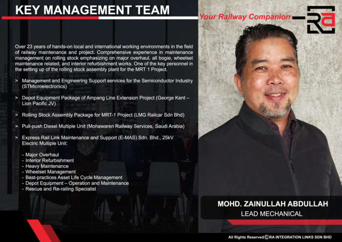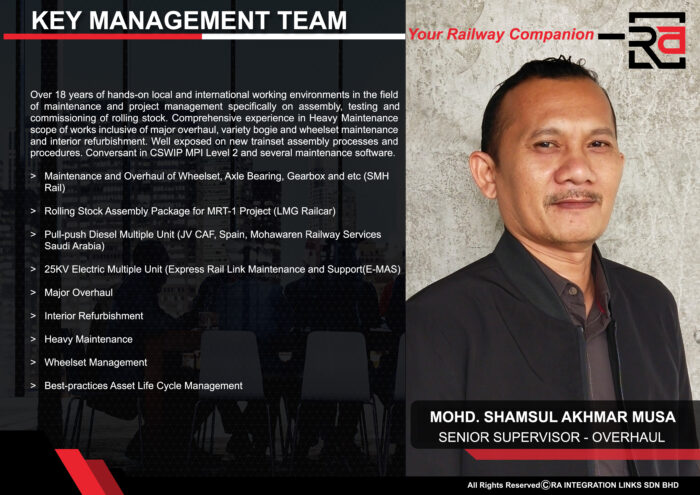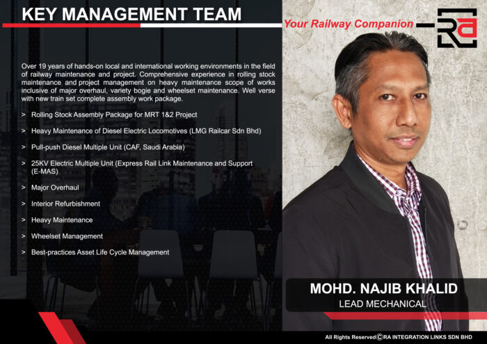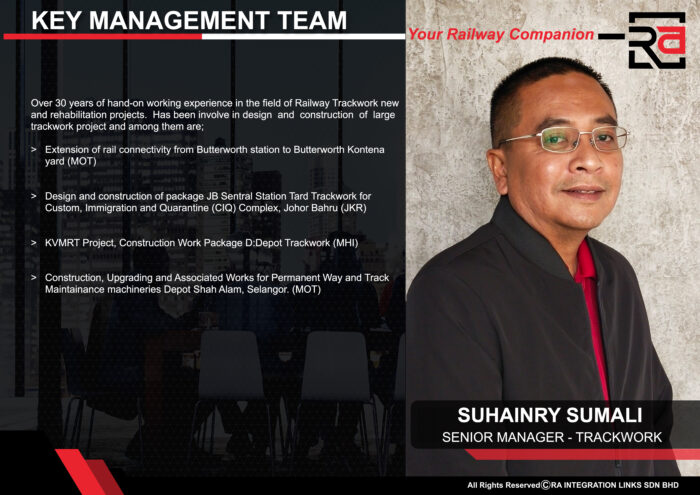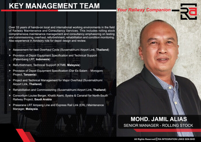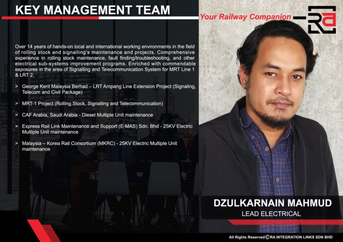 RAILSB team expertise varies with blend of experiences and cultures which forms homogeneous work teams to deliver the requirements according to the best safety and quality standards. The team comprise of professionals which is highly experienced and well trained in their individual field. They have been providing services to the rail industry for more than 15 years. Our team members are highly respected for proven expertise and capabilities in their job specialties and recognised for proven track record on local and international projects.